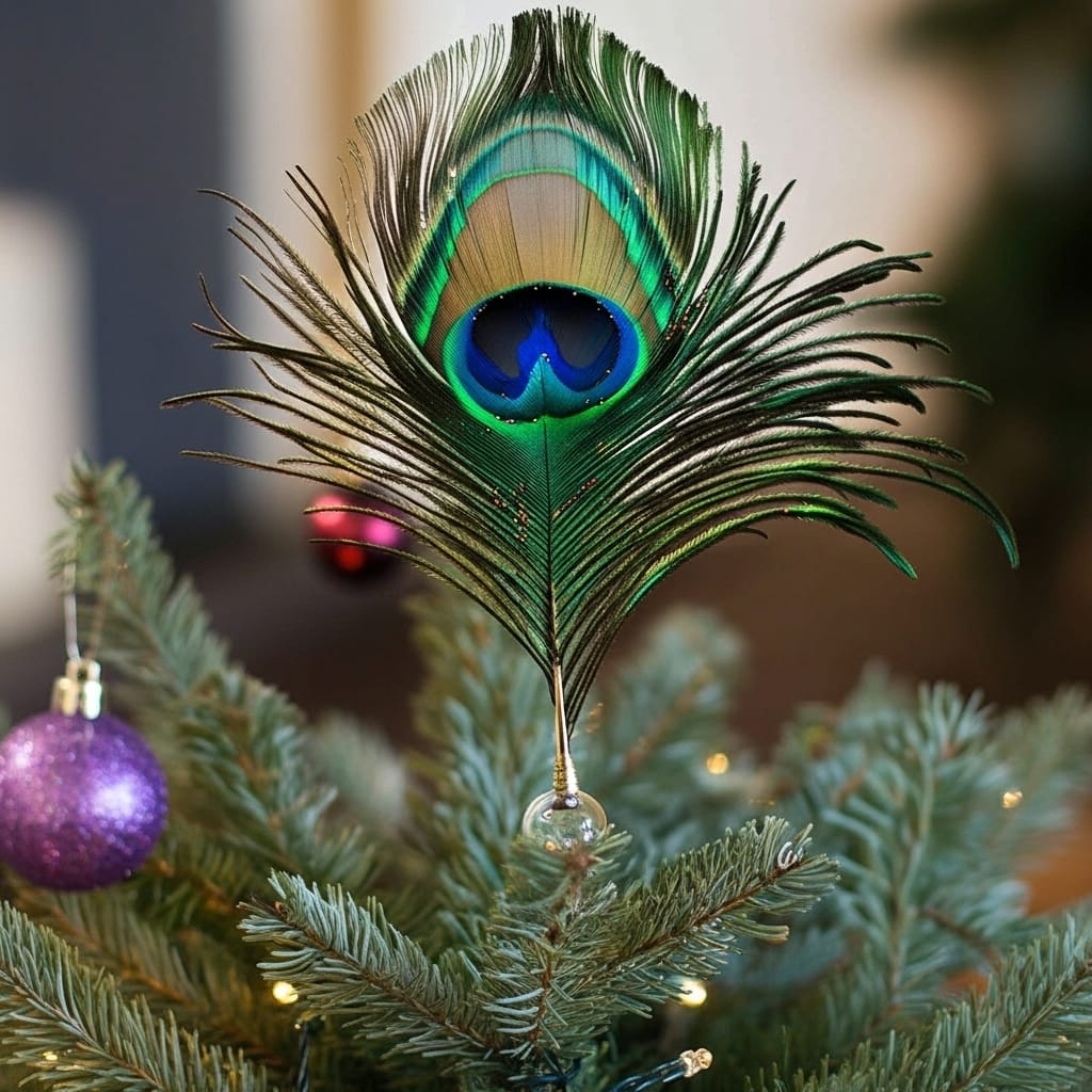 For something totally unexpected and glamorous, top your tree with peacock feathers. The shimmering greens, blues, and golds create a luxurious focal point that stands out beautifully against twinkling lights.