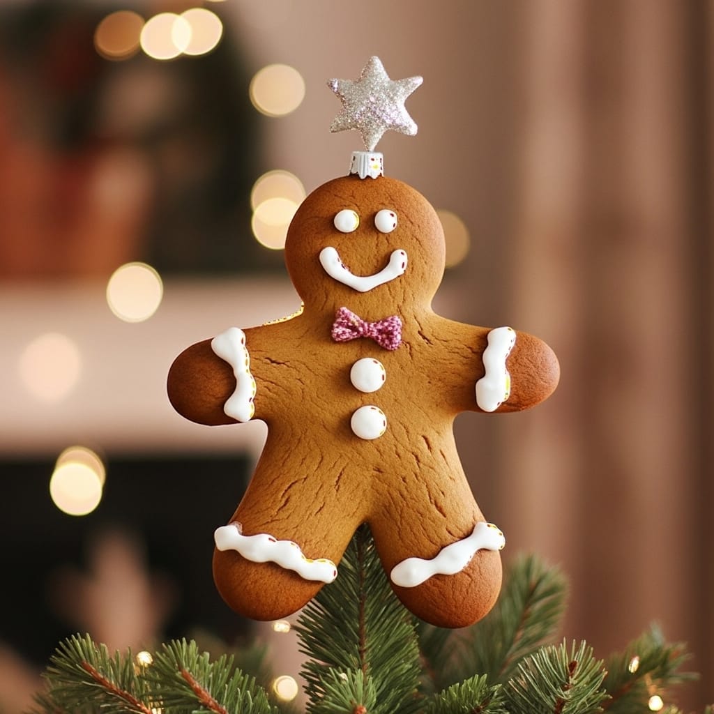 A gingerbread man topper is pure sweetness — literally and figuratively! It adds a warm, family-friendly vibe, especially when paired with candy-themed ornaments and cookie garlands.