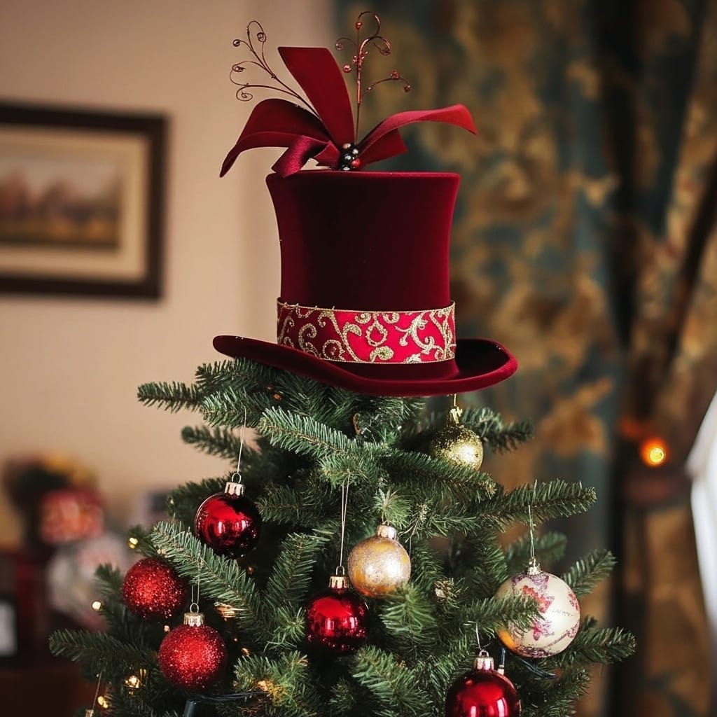 For a creative, slightly whimsical twist, a top hat topper adds instant personality to your Christmas tree. Inspired by snowmen and vintage Christmas style, it’s both playful and stylish.