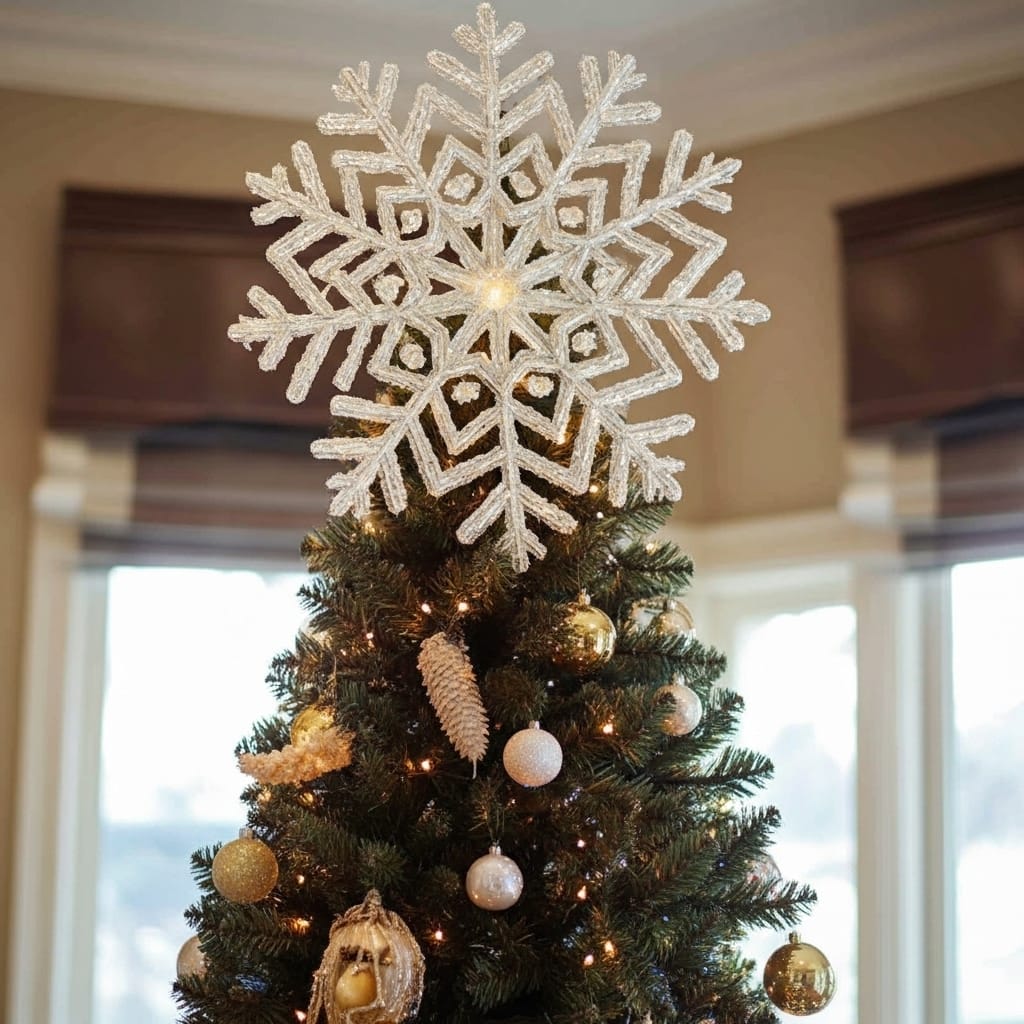 If your holiday decor leans toward the “Winter Wonderland” theme, a snowflake topper is a perfect choice. Its intricate design and delicate shine mimic freshly fallen snow.