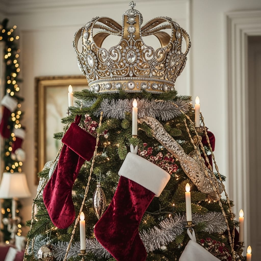 If you’re dreaming of a tree that looks straight out of a Christmas movie, a crown topper delivers royal sophistication. Gold or silver crowns adorned with faux jewels add an elegant, vintage-inspired feel.