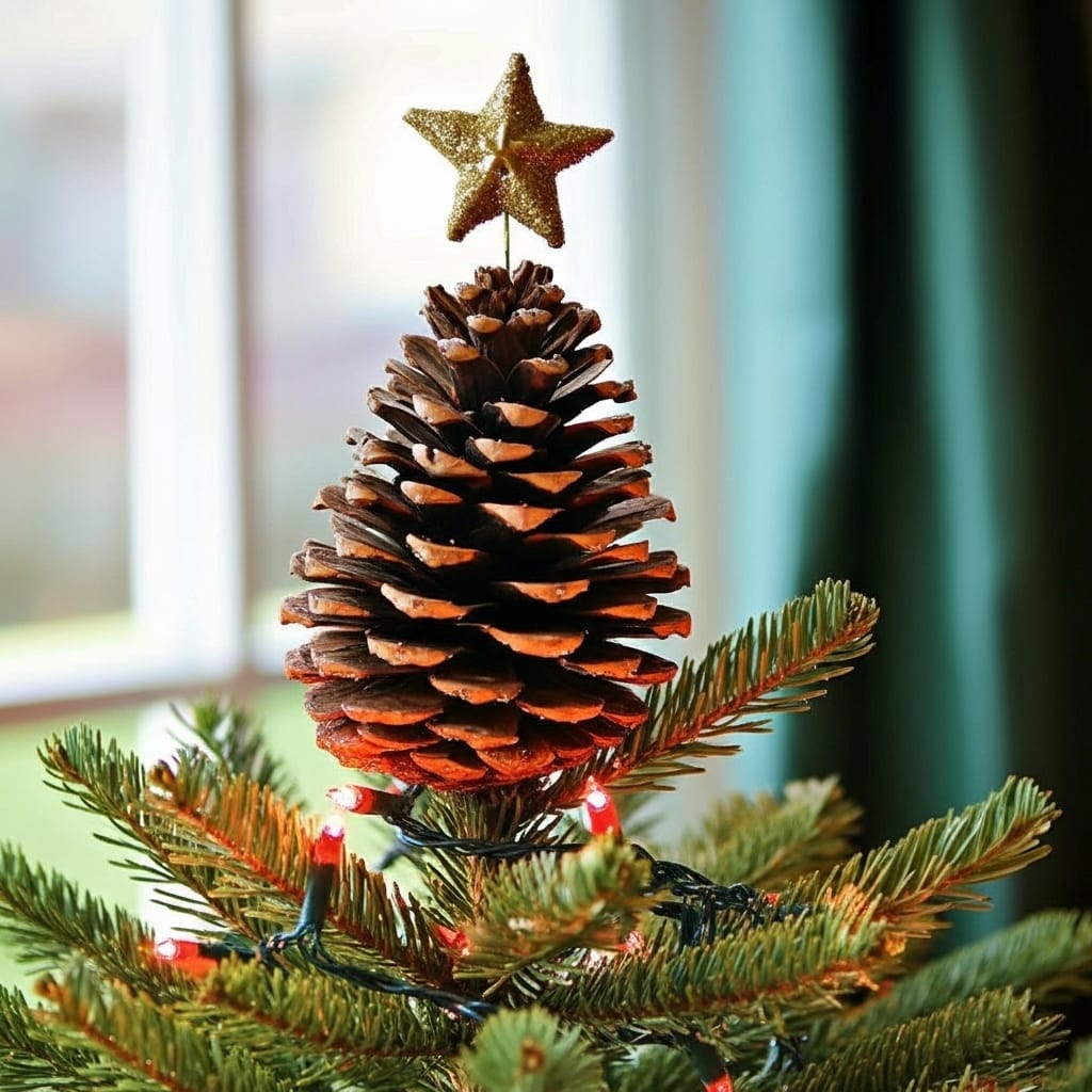 Bring a touch of nature indoors with a pinecone topper. This organic choice works beautifully for farmhouse, woodland, or cozy cabin styles. Whether you keep it natural or add a touch of glitter, pinecones bring a warm, earthy feel to your Christmas tree.