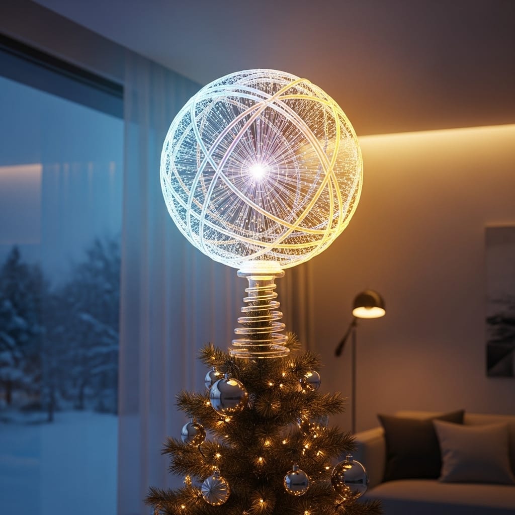 If you want your tree to shine, go for a light-up globe topper, literally. These modern designs often change colors or glow softly, casting a warm, mesmerizing light across your space.