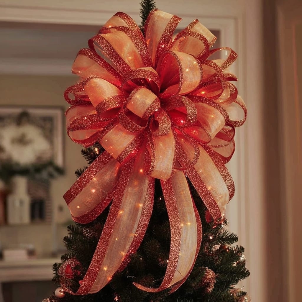 For effortless elegance, a large bow topper is both simple and stunning. Made with velvet or satin ribbon in classic holiday hues like red, champagne, or emerald, it instantly ties your whole look together — quite literally.