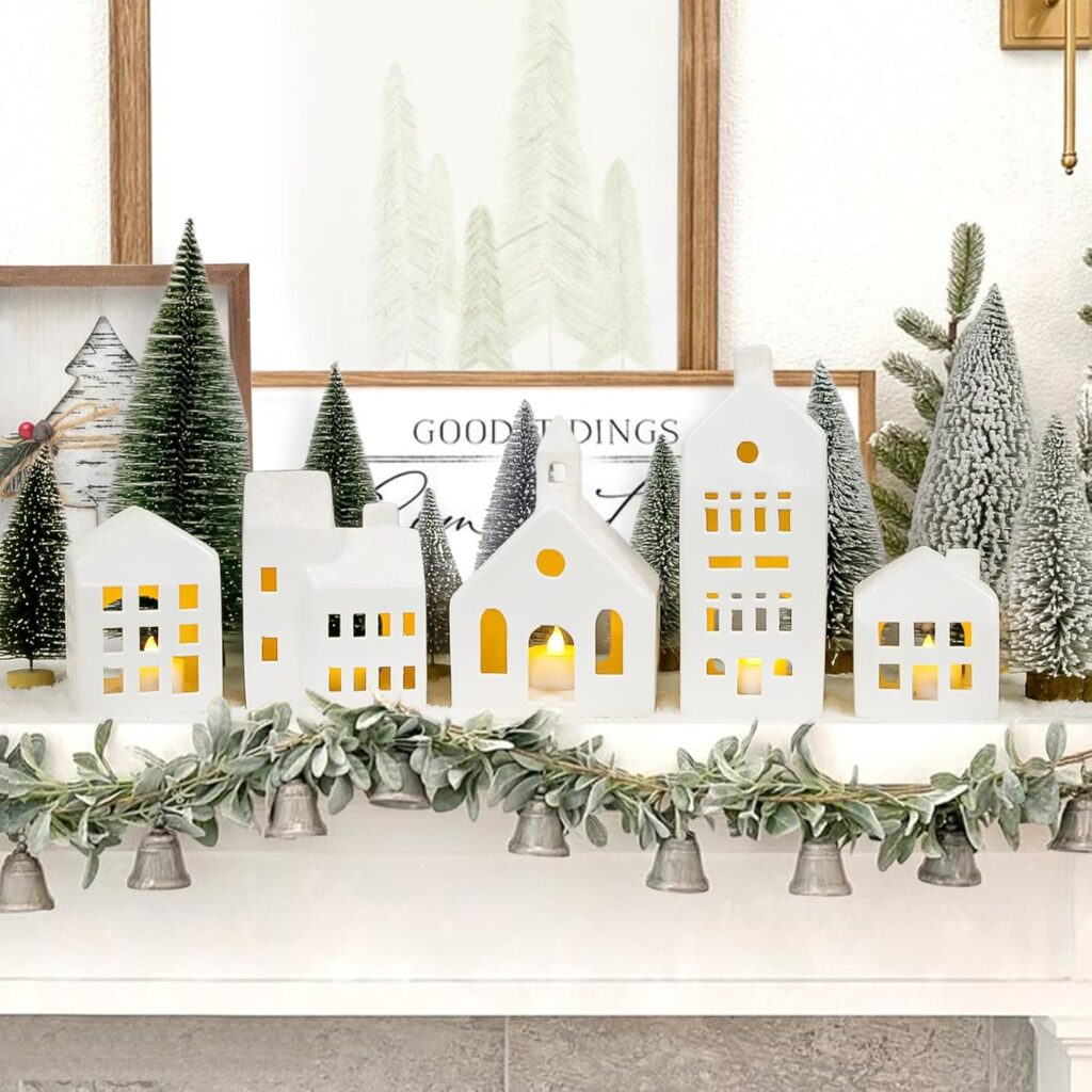 Soft white ceramic houses, frosted pinecones, and olive satin ribbons make your mantel glow like a winter village scene.