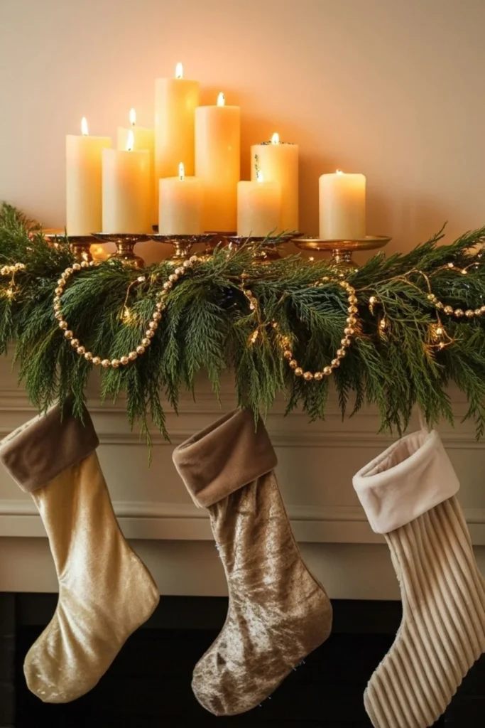 Cedar garland meets gold bead swag and glowing pillar candles for a refined holiday moment.
