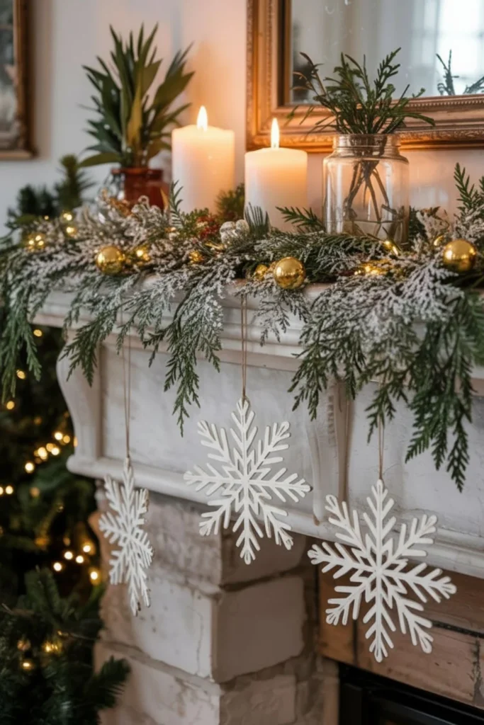 Wooden snowflake ornaments, jars of cedar sprigs, and soft fairy lights bring cozy farmhouse magic to Christmas Decor Ideas for Mantels. An absolute stunning Christmas Decor Ideas for Mantels.