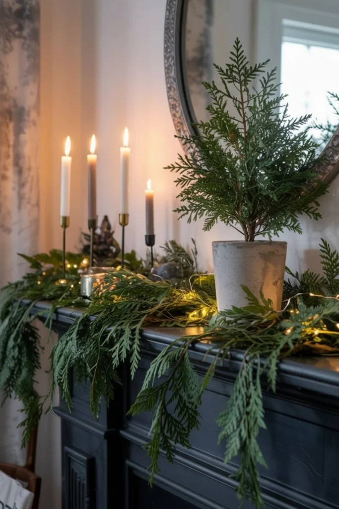 Loose cedar garland, fairy lights, and a few brass taper holders — minimal but warm. The trick is layering without cluttering.