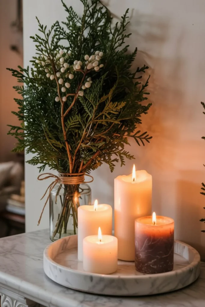 Cedar sprigs, white berries, and marble-tray candles — minimal, spa-like Christmas Decor Ideas for Mantels and perfectly peaceful.