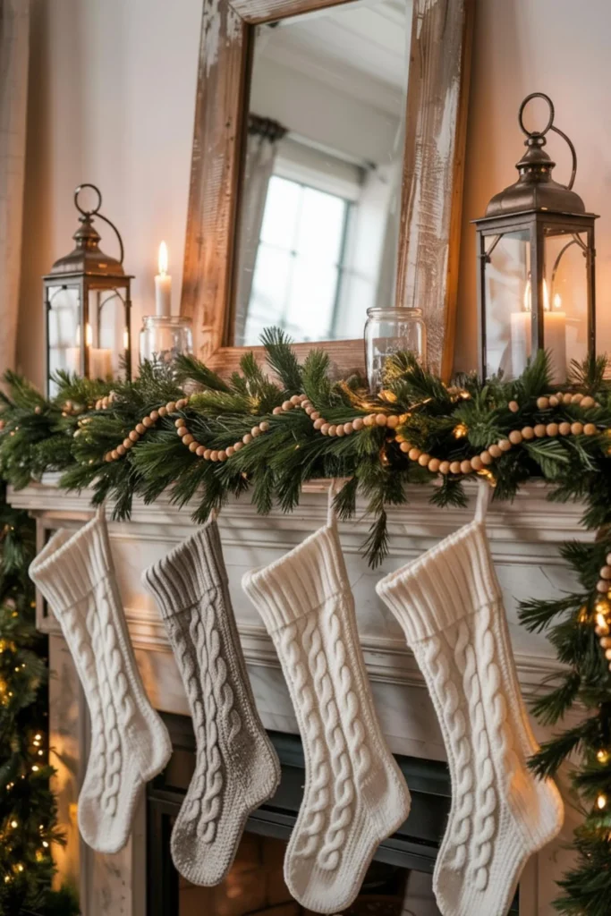 Wood bead garland, lanterns, and cable-knit stockings make this look equal parts cozy and classic.