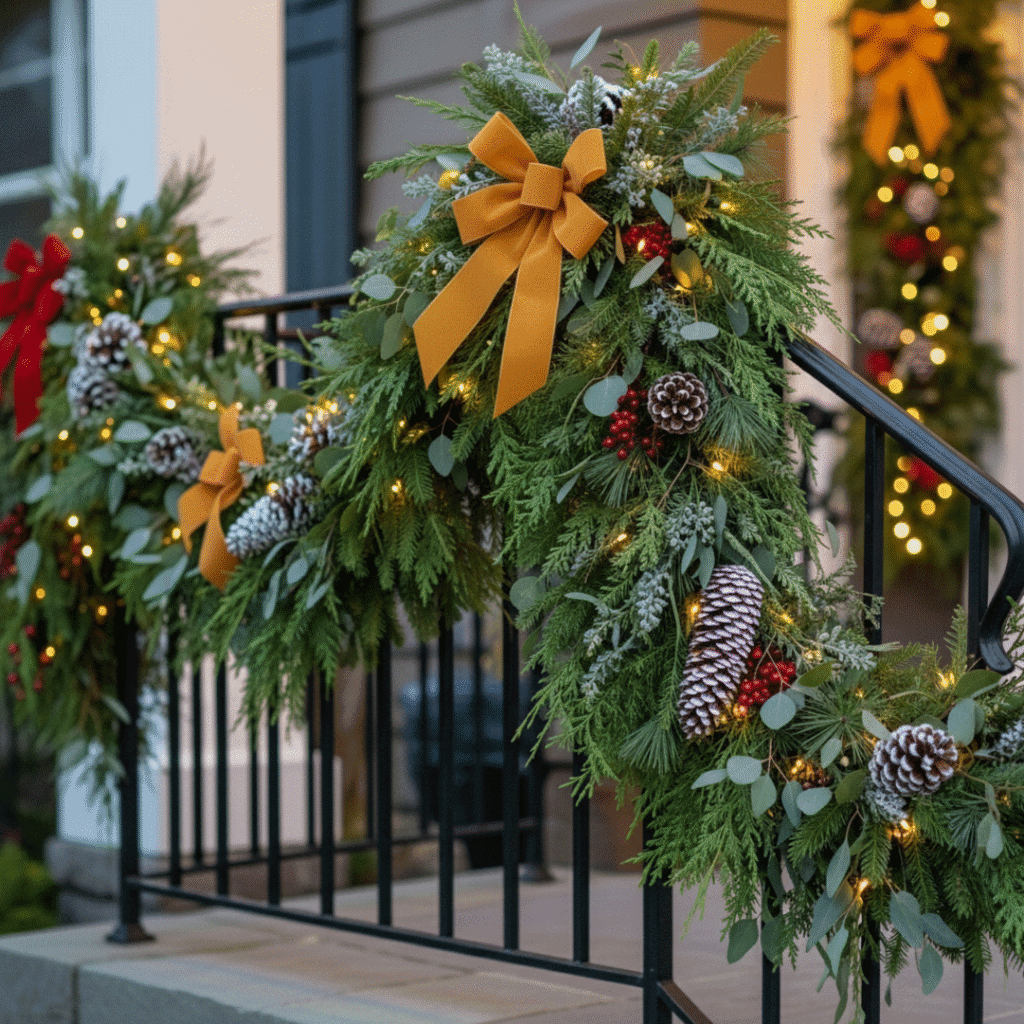 Wrap a wreath around the railing and tie in adventure lights, red bows or frosted pinecones. This timeless classic never goes out of style, offering immediate charm.