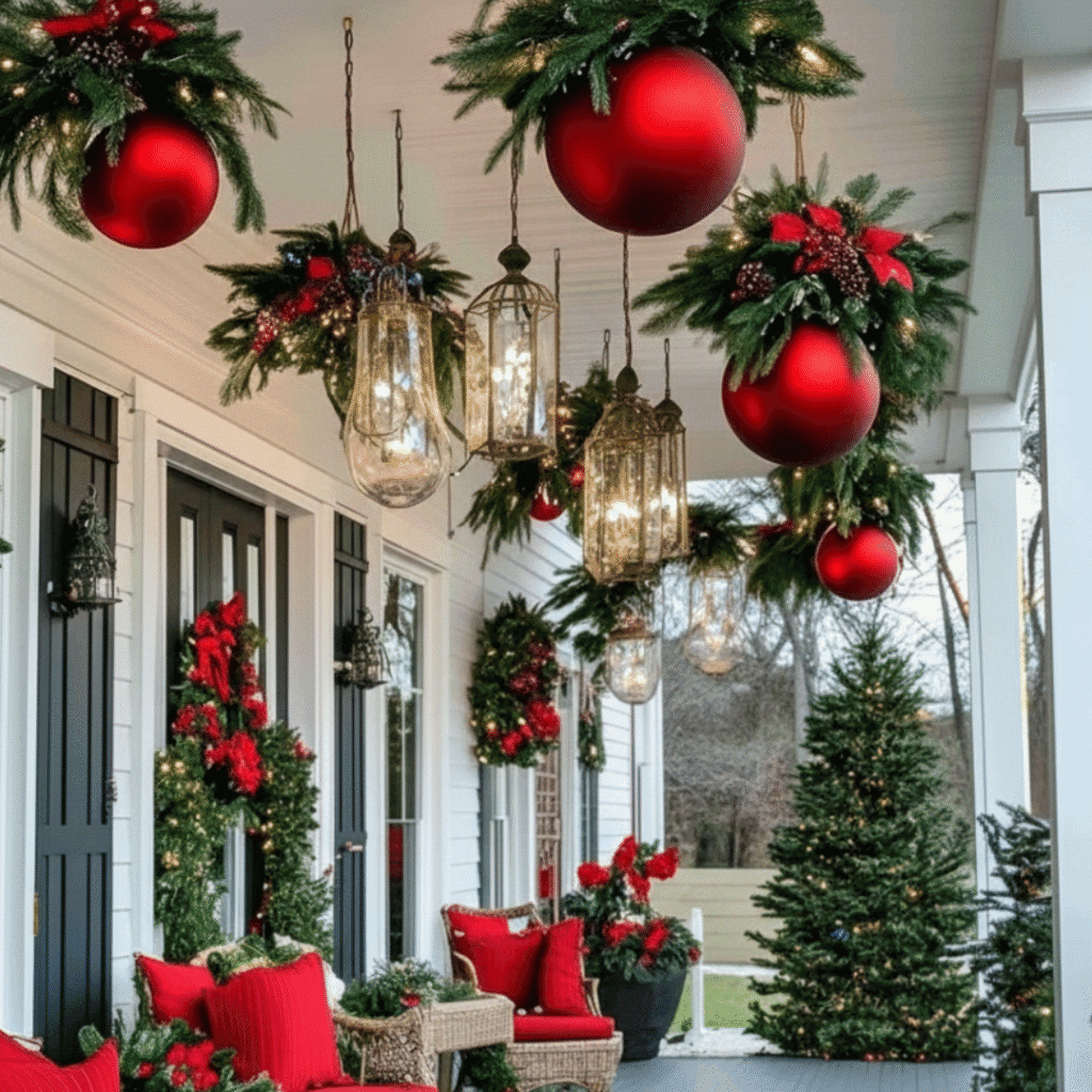 Hang large ornaments at different heights from the porch or beams. Mix blank and matte finishes to add visual depth and festive drama to your layout.