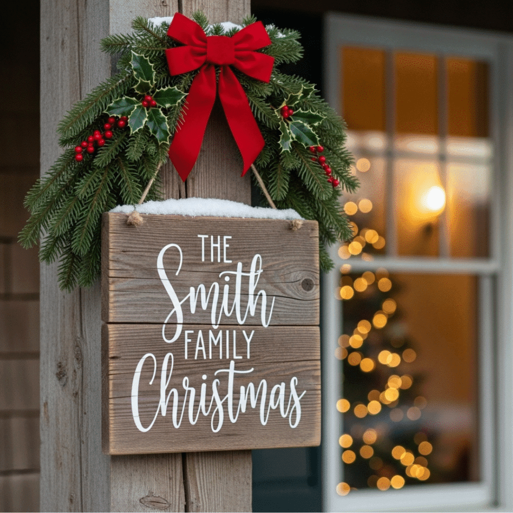 Complete your design with a custom wood sign – think “Merry Christmas”, “Welcome Home”, or even your family name. This simple feature adds warmth and personality to your porch.