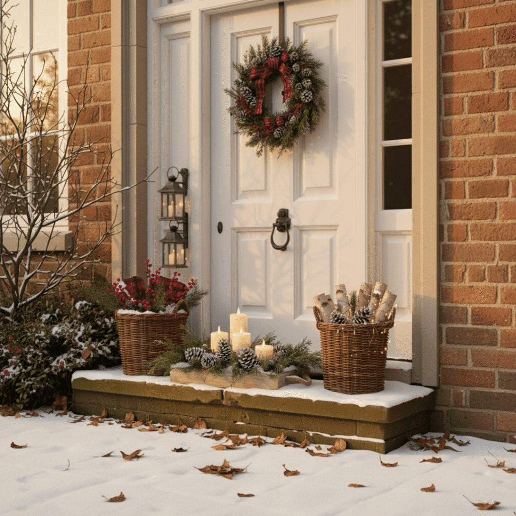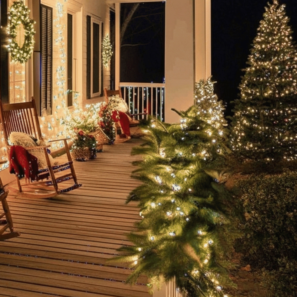 Transform your front porch into a mini winter retreat with plaid blankets and holiday cushions. It’s cozy, inviting, and perfect for sipping cocoa while enjoying your lights display.