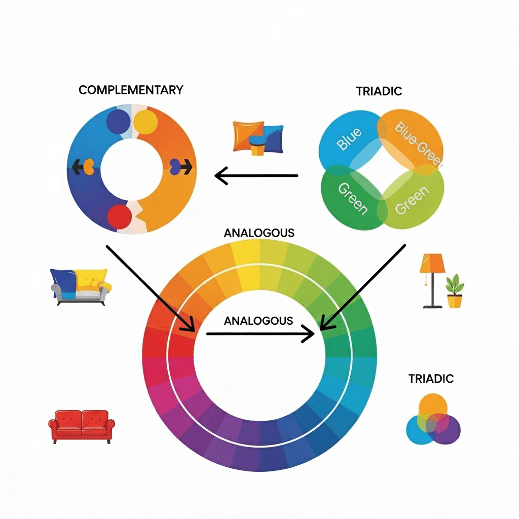 - Triadic: Three evenly spaced colours (e.g., red + yellow + blue) for lively balance