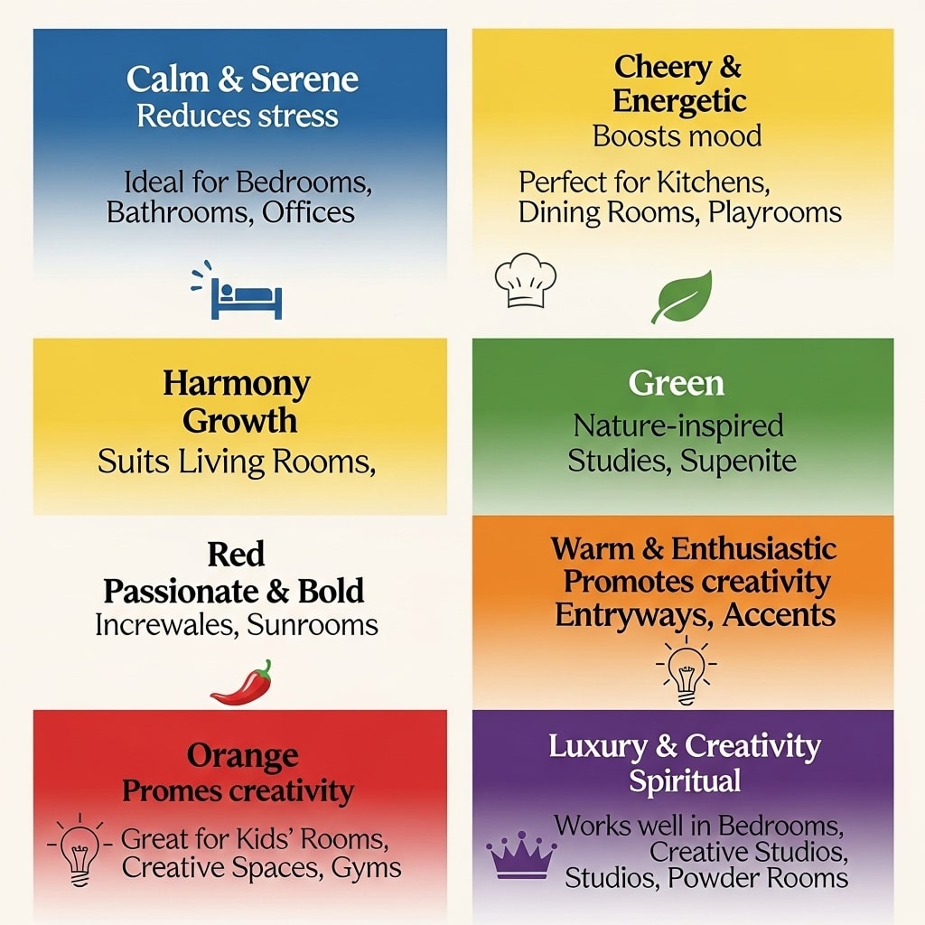 | Yellow | Energizing, cheerful | Kitchens, hallways |