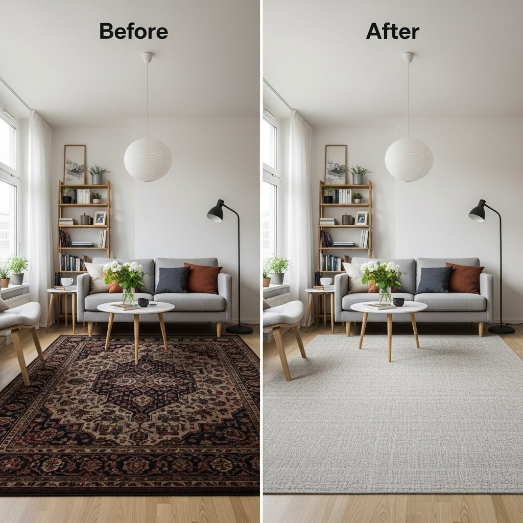 - Avoid dark rugs with heavy borders — they visually shrink the floor area.