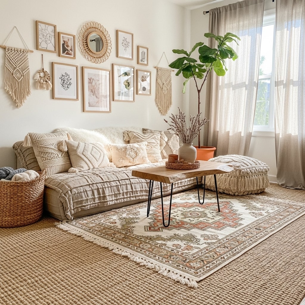 This technique not only adds depth and texture but also allows flexibility — you can swap the top rug seasonally without redoing the entire room.