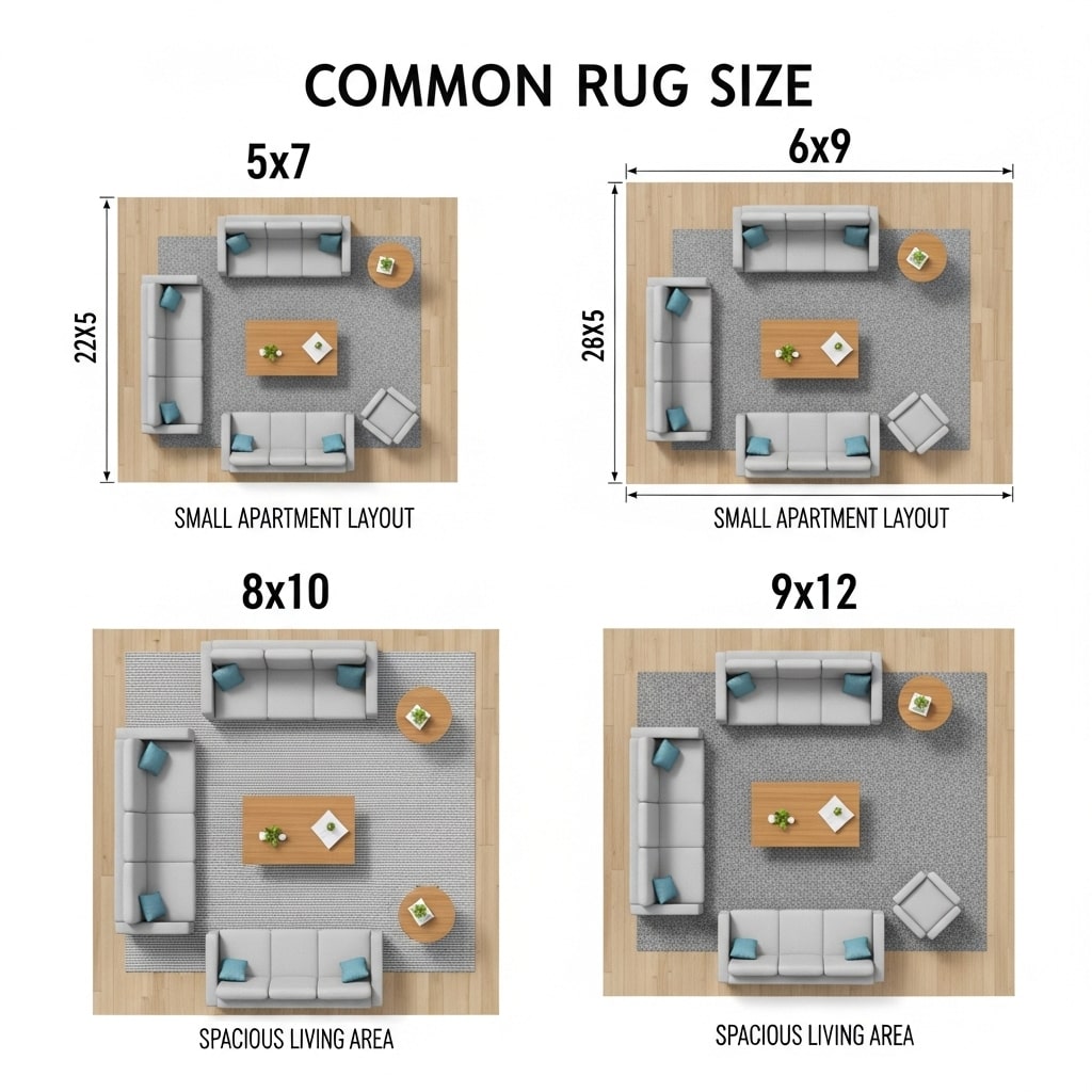 The goal is to visually anchor your furniture while maintaining proportion to the room size. In an apartment, this usually means choosing between 5’x7’, 6’x9’, or 8’x10’, depending on how you arrange your furniture.