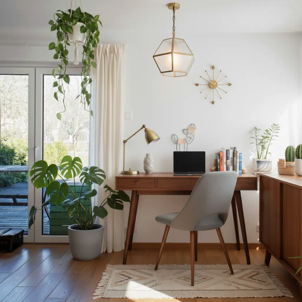 It broke the monotony, added organic movement, and subtly echoed the curvature of my walnut desk. Over time, I added a hanging pothos near the window and a mini cactus on the shelf. Suddenly, the space felt alive yet composed.