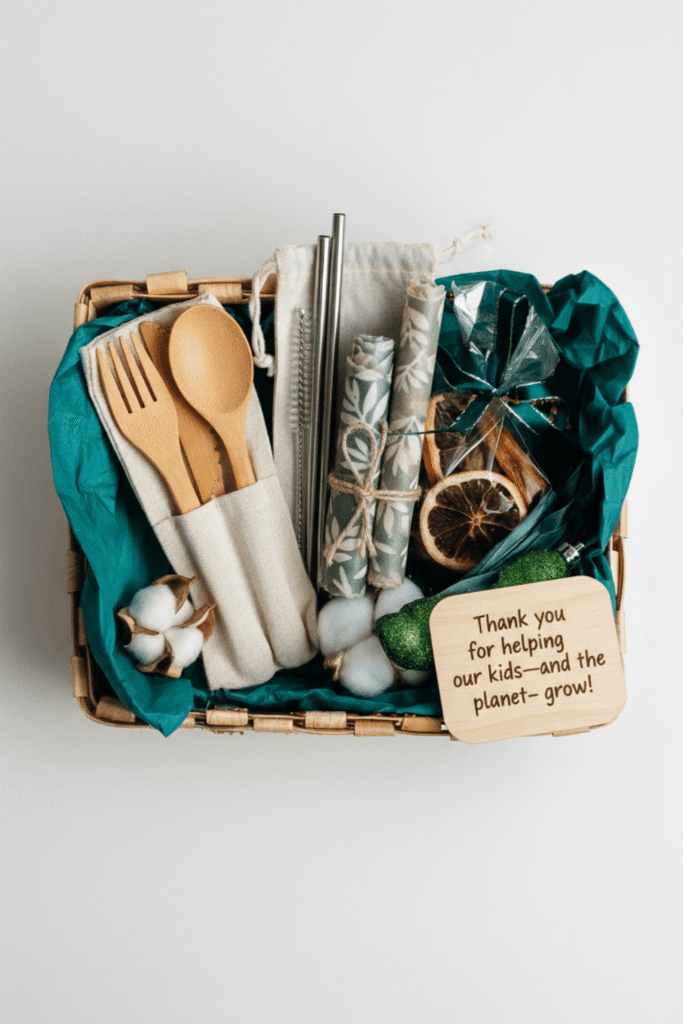 | Eco-Friendly Basket | Sustainability-focused teachers | Bamboo utensils, reusable mug, organic snacks | $40–$55 |