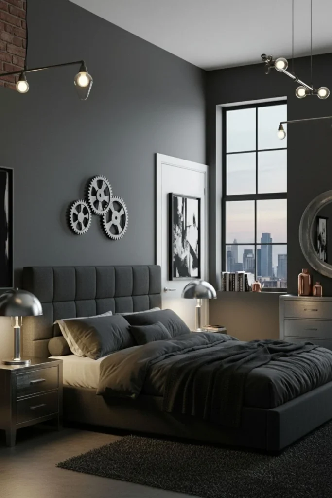 For a sleek, urban feel, charcoal grey is one of the best modern options. It adds sophistication while maintaining a cozy, moody vibe. Charcoal works beautifully in minimalist spaces or industrial-style bedrooms, especially when paired with white trim and metallic fixtures.