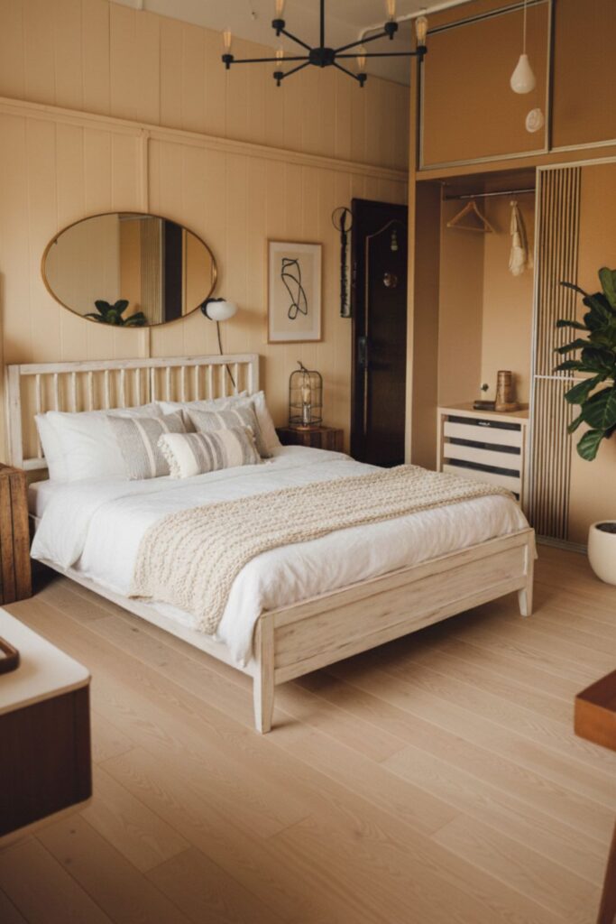 You can also experiment with accent walls to add visual depth without overwhelming the space. For instance, a dark navy or charcoal wall behind the bed can create a strong focal point while keeping the rest of the room light and balanced.