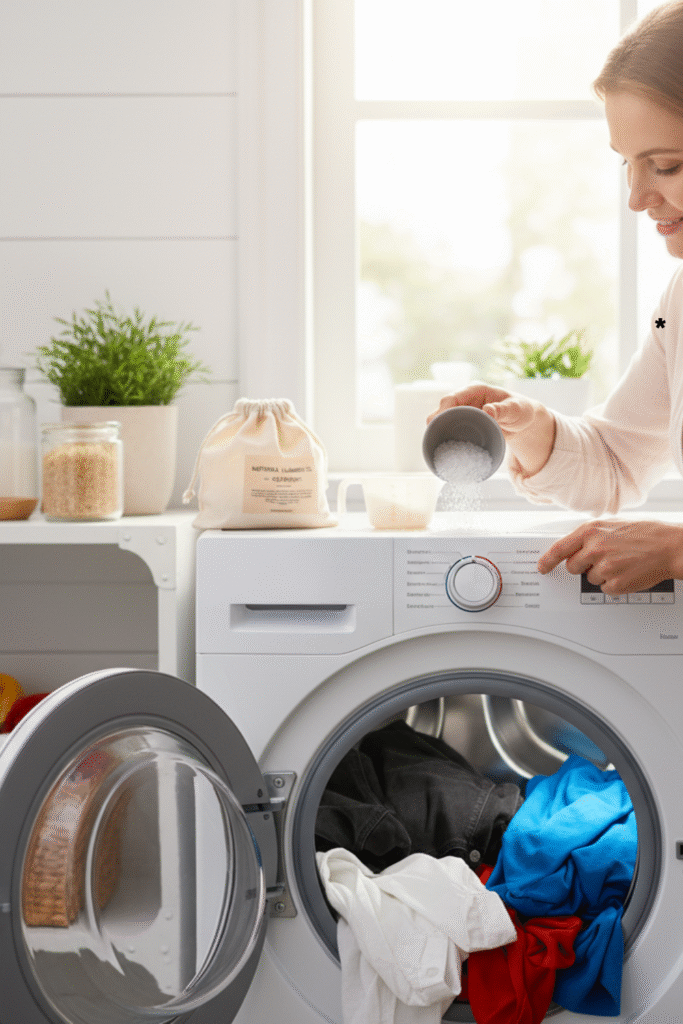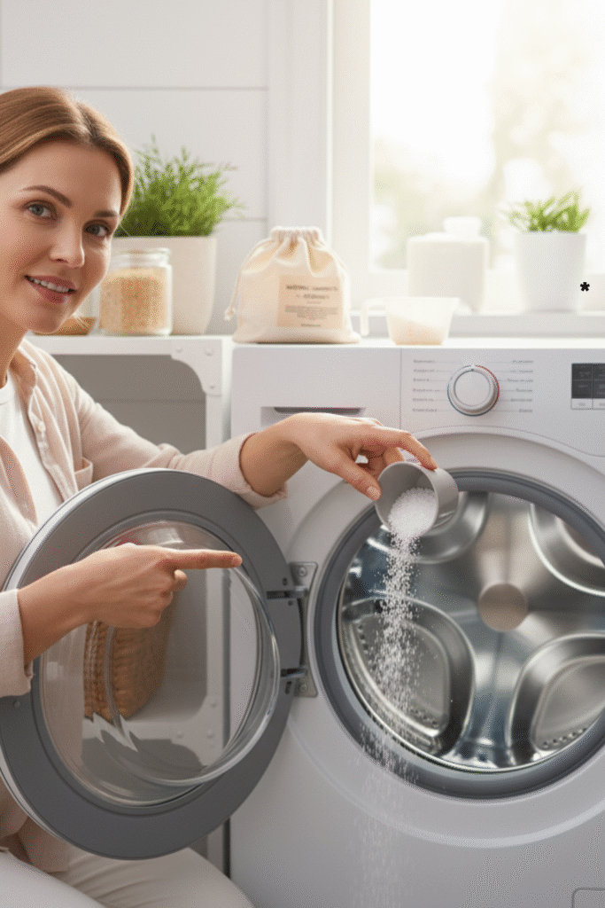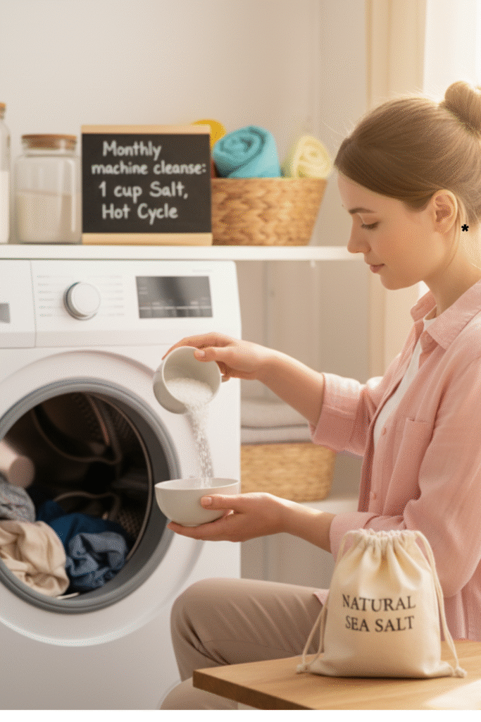Add half a cup of salt to the rinse cycle. It relaxes fabric fibers, reduces stiffness, and makes clothes feel more comfortable. The result? Naturally soft laundry, free from synthetic fragrances and chemicals.