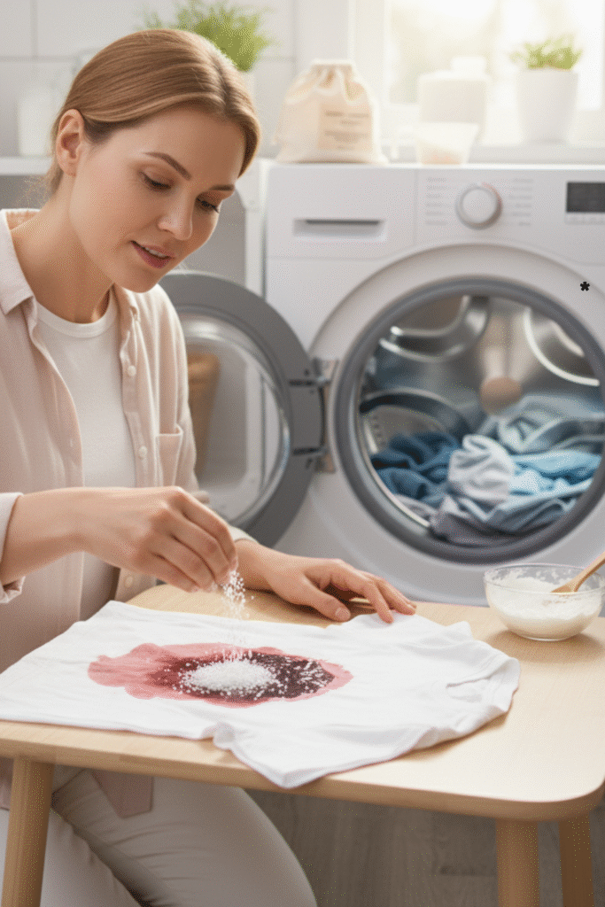 For fresh stains, such as wine, sweat, or grease, sprinkle salt directly onto the spot before washing. It absorbs moisture and helps lift the stain. For tougher marks, make a paste with salt and water, apply it to the fabric, and let it sit for 15 minutes before rinsing.