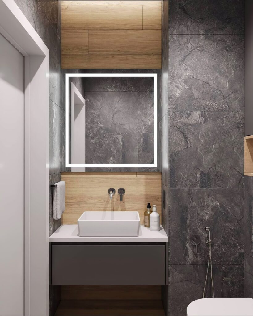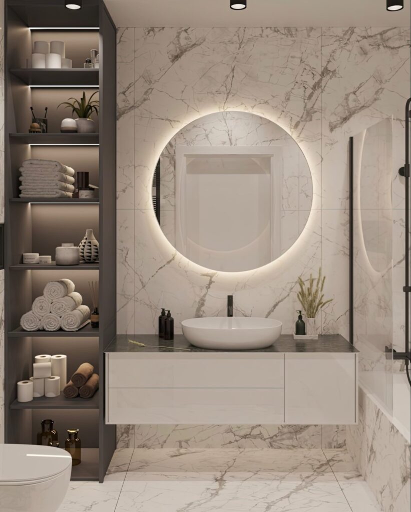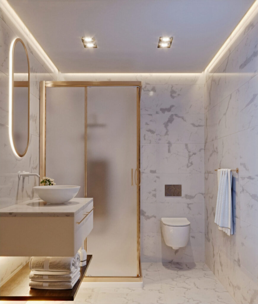 Lighting is key in small bathrooms. Layered lighting ensures functionality while adding ambiance.
