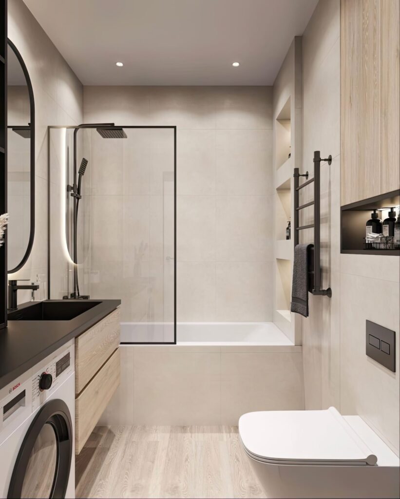 Light colors like white, beige, and soft gray work best in small bathrooms. They reflect natural Light and create a clean, open feeling—accented with darker shades for balance.