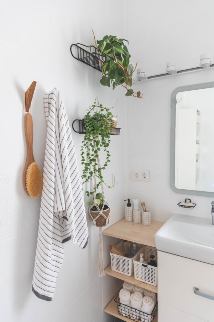 In small bathrooms, wall space is your best friend. Use the height to your advantage with built-in vertical shelving or mounted cabinets.