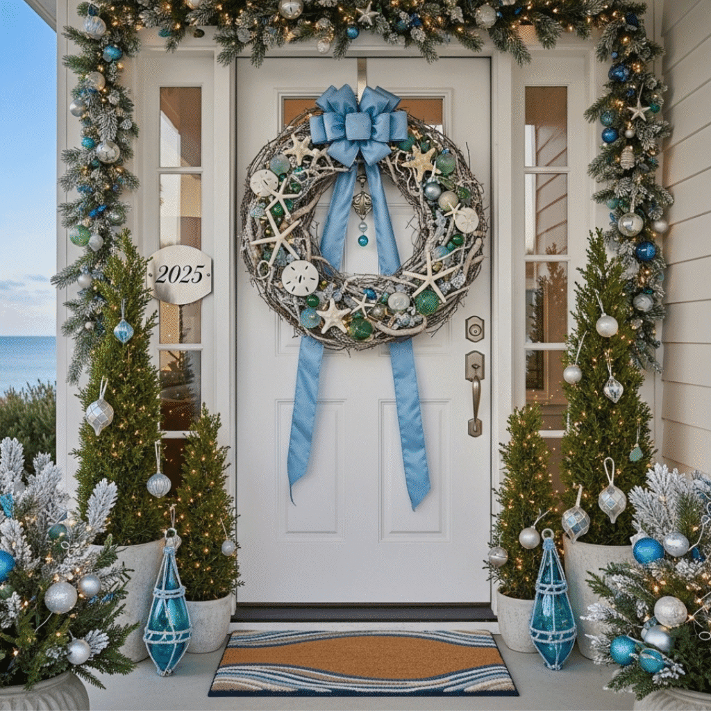 If you live by the sea (or wish you did), go for coastal-inspired decor — think driftwood wreaths, sea glass ornaments, and soft blue ribbons mixed with white lights. It’s breezy, elegant, and unique for 2025.
