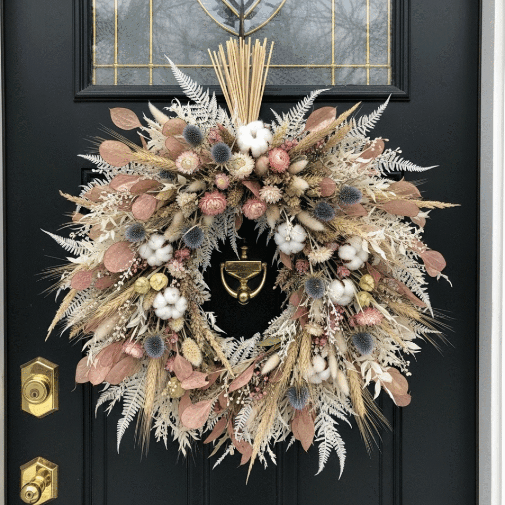 Trade evergreen for dried flowers, wheat, and cotton stems in muted tones. This 2025 trend gives your entryway a soft, boho-luxe vibe while remaining eco-friendly and timeless.