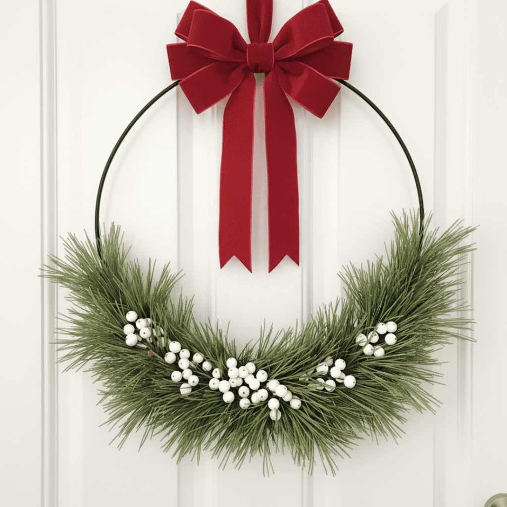 Keep it sleek and modern with a simple metal hoop wreath wrapped in pine branches, white berries, and a single silk ribbon. This minimalist approach captures the Scandinavian trend dominating Christmas door decoration ideas in 2025 — one that is calm, elegant, and effortlessly chic.
