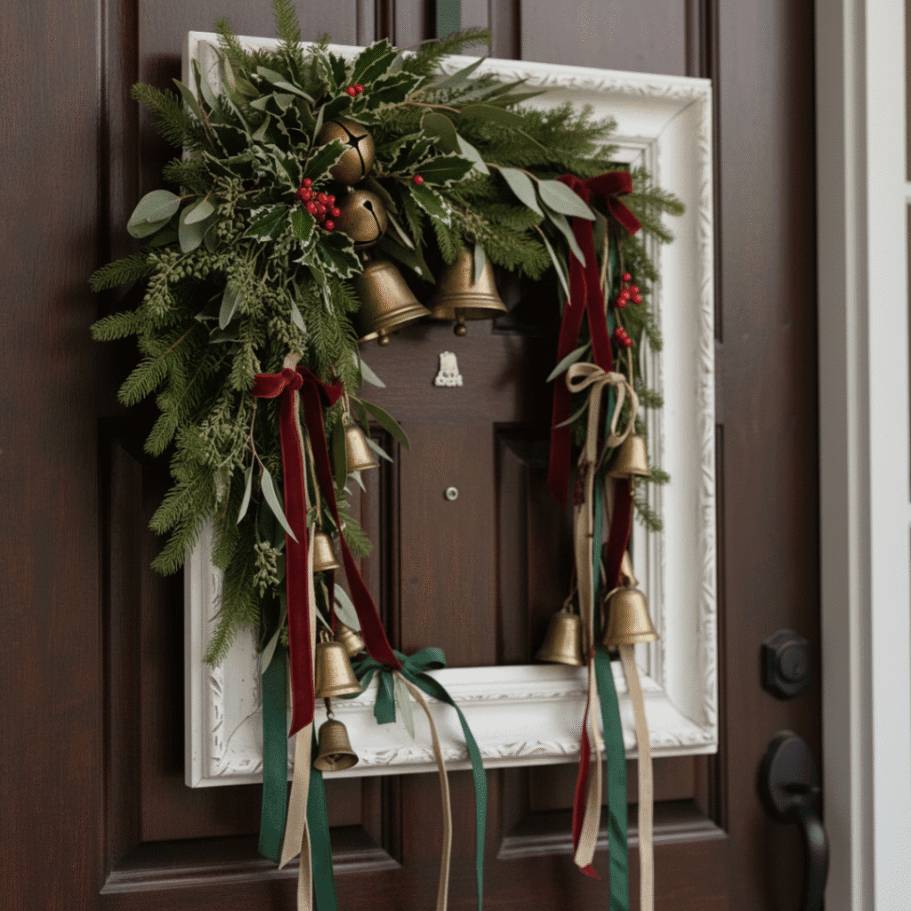 Upcycle an old picture frame by painting it gold or white and filling it with greenery, bells, and ribbon. It’s a creative, budget-friendly idea that adds an artistic twist to your Christmas door decorations.