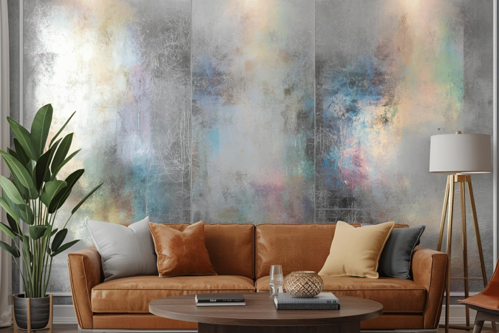 Wall prints with holographic and iridescent finishes are transforming living rooms. These shimmering surfaces shift colors with the light, adding energy to the walls.